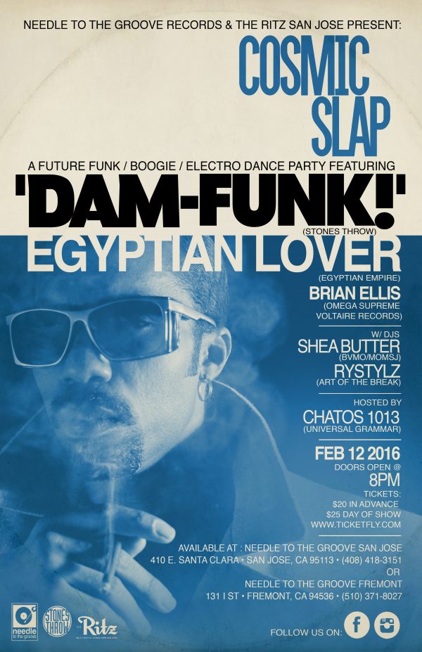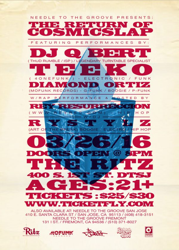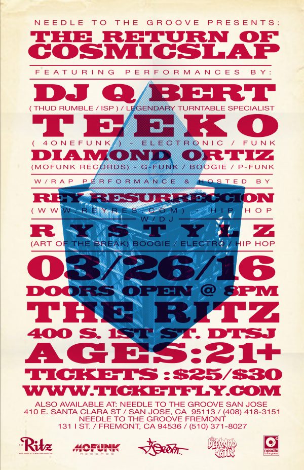 In 2016, we threw a couple of electronic music events we called Cosmic Slap. The first show included Dam-Funk, Egyptian Lover, Brian Ellis, & DJ RyStylz and the second event featured DJ Qbert, Teeko, Diamond Ortiz, & DJ RyStylz. Both events were held at the Ritz San Jose & were a huge success. Thank you to all who came out! If you missed out stay tuned for future events .